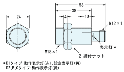 | 材質 | ケース: ステンレス (SUS316L) 検出面: ポリブチレンテレフタレート (PBT) 締めつけナット: ステンレス (SUS316L) |