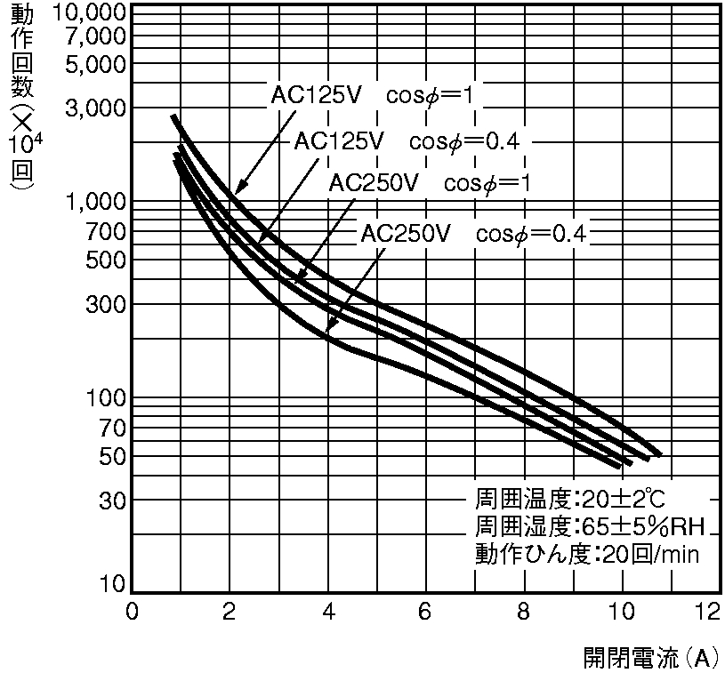 開閉能力(AC) | 抵抗負荷: AC125V 10A/AC250V 10A ランプ負荷(NC): AC125V 3A/AC250V 2.5A ランプ負荷(NO): AC125V 1.5A/AC250V 1.25A 誘導負荷: AC125V 10A/AC250V 10A 電動機負荷(NC): AC125V 5A/AC250V 3A 電動機負荷(NO): AC125V 2.5A/AC250V 1.5A |