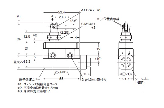 | アクチュエータ | パネル取り付けローラ・プランジャ形 φ11×4.7 ステンレス焼結合金ローラ |