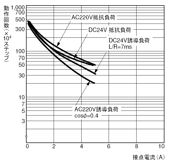 AC220V 5A (抵抗負荷) AC220V 3A (誘導負荷 (cosφ=0.4)) DC24V 5A (抵抗負荷) DC24V 4A (誘導負荷 (L/R=7ms)) |