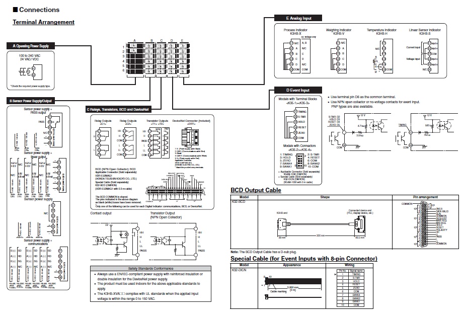 | Event input | Number of input | 5 point | Input method | NO-Voltage contact/NPN open collector | Event name | Timing input Startup compensation timer input Hold input Forced-zero input Reset input | Connection method | Terminal blocks | Contact | ON: 1 kΩ max. OFF: 100 kΩ min. | No-contact | ON residual voltage: 2 V max. (TIMING input 3 V max.) OFF leakage current: 4 mA max. (TIMING input 17 mA max.) Maximum applied voltage: 30 V max.DC Leakage current: 0.1 mA max. (TIMING input 1.5 mA max.) |