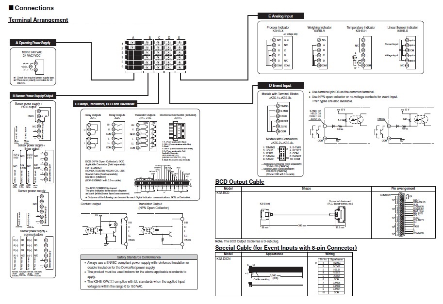 | Event input | Number of input | 5 point | Input method | NO-Voltage contact/NPN open collector | Event name | Timing input Startup compensation timer input Hold input Forced-zero input Reset input | Connection method | Terminal blocks | Contact | ON: 1 kΩ max. OFF: 100 kΩ min. | No-contact | ON residual voltage: 2 V max. (TIMING input 3 V max.) OFF leakage current: 4 mA max. (TIMING input 17 mA max.) Maximum applied voltage: 30 V max.DC Leakage current: 0.1 mA max. (TIMING input 1.5 mA max.) |