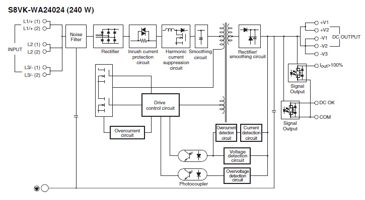 | Input | Rated input voltage | 200 to 240 VAC (Three-phase/single-phase/two-phase) | Allowable input voltage variable range | 170 to 264 VAC (Three-phase/single-phase/two-phase)/265 to 300 VAC (1 s) 240 to 350 VDC | Frequency | 50/60Hz (47 to 63 Hz) | Rated input current | 0.80 A typ. (at three-phase 200 VAC input) 1.4 A typ. (Single-phase/two-phase 200 VAC input Single-phase/two-phase 200 VAC input) 0.70 A typ. (at three-phase 230 VAC input) 1.2 A typ. (Single-phase/two-phase 230 VAC input) | Power factor | 0.9 min. | Leakage current | 1.0 mA max. (at three-phase 200 VAC input) 1.0 mA max. (at three-phase 230 VAC input) | Inrush current (cold start at 25 ℃) | 13 A typ. (at three-phase 200 VAC input) 15 A typ. (at three-phase 230 VAC input) |