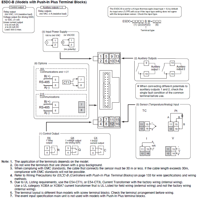 | Sold separately | Push-In Plus Terminal Block Unit: E5DC-SCT1B USB Serial Conversion Cable: E58-CIFQ2 Communications Conversion Cable: E58-CIFQ2-E Mounting adapter: Y92F-53 Unit label: Y92S-L2 CX-Thermo Support Software: EST2-2C-MV4 DIN Tracks: PFP-100N/PFP-50N Spacer: PFP-S End Plate: PFP-M End Cover: Y92F-54 Connector cover: E53-COV26 | |