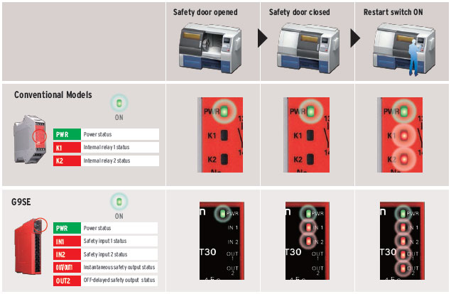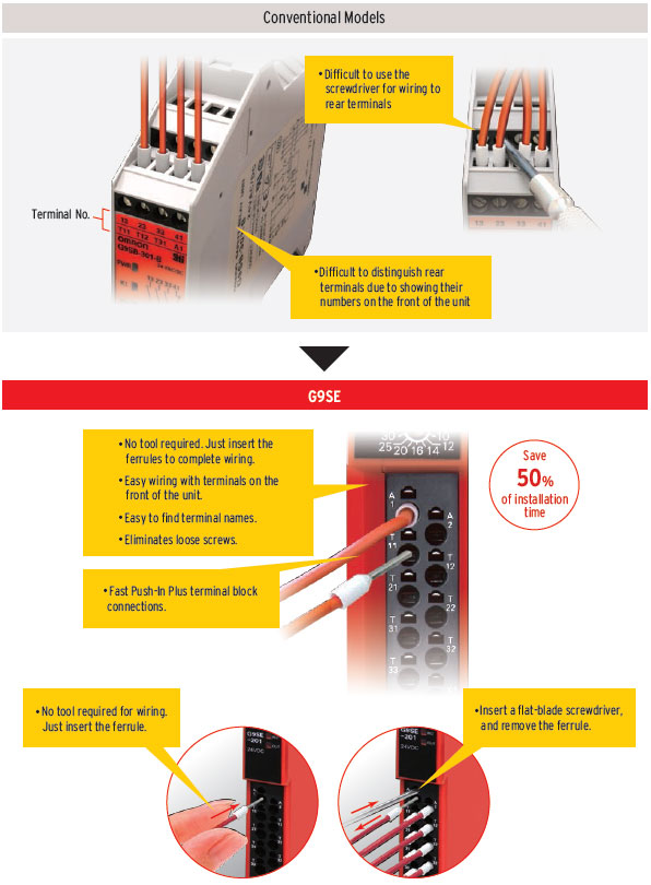 Omron's new G9SE series of safety relay units offers an easy approach for various simple safety applications. The G9SE saves mounting space, lowers installation cost with Push-In Plus terminal block, and reduces operational cost with intuitive diagnostic indicators.