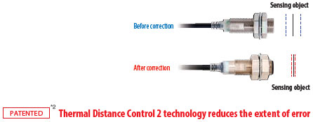 Proximity sensors with longer sensing distance require increased sensitivity. However, with the increased sensitivity, temperature changes will have bigger influence in sensing distance, and differences between individual sensors will be bigger. E2E NEXT Proximity Sensors (3-wire models) solve these issues by newly implementing Thermal Distance Control 2, a technology to enable extended sensing ranges. It enables in-line measurements of each sensor’s temperature characteristics, using multiple temperature points, in IoT-enabled production processes. The optimal correction values are then calculated based on our unique algorithm. The values are written into the analog digital hybrid IC (PROX3) for shipping to minimize differences between sensors and the influence of temperature changes that may occur in the customer’s environments.