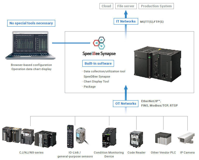 Data from different devices, including non-OMRON PLCs, can be collected in time-series format.