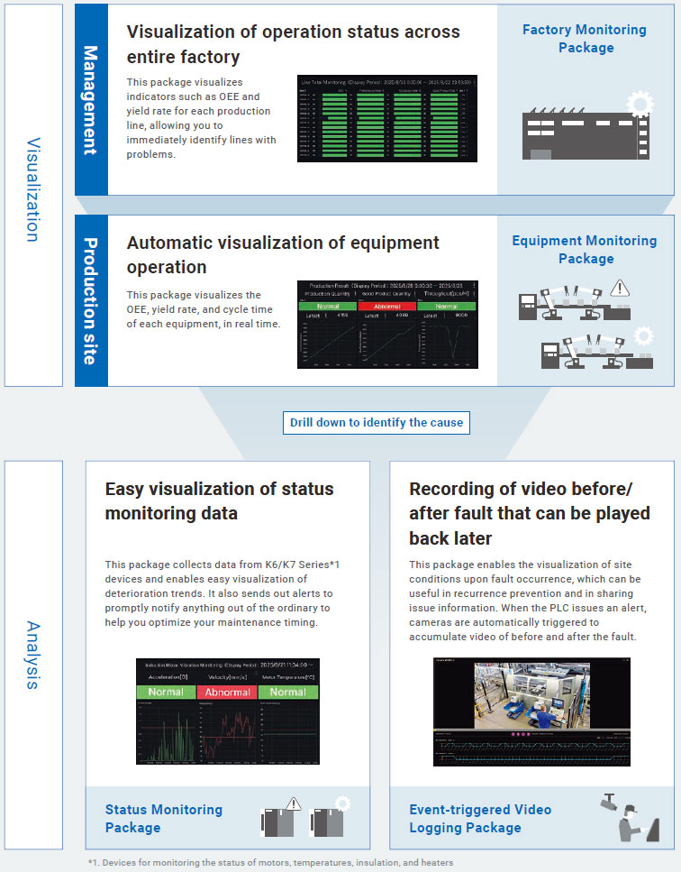 The Packages helps you track uptime, identify stoppage causes, and make improvements. It coordinates four separate packages to visualize everything from individual equipment and devices to the factory at large along the same timeline, and links KPIs with on-site operations. Each package can also be individually implemented, allowing you to start small according to the specific needs of your production site.