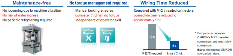 • The M12 connector with excellent environmental resistance (IP67) adopts a Smart Click mechanism, enabling one-touch mating with approximately a 1/8 turn.