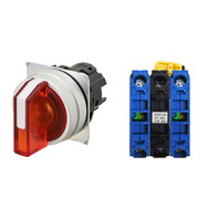 Selector Switch (22-dia.), Lighted, 3-position, Brushed metal bezel, Automatic reset on right, Operation unit color: Red (Transparent), IP66, Screw Terminal Block, Contacts: NO/Lighting Unit/NO, LED lamp color: Red, LED Lamp voltage: 200/220/230/240 VAC