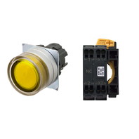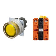 Pushbutton Switch (22-dia.), Lighted, Brushed metal bezel, Full guard, Momentary, Button color: Yellow, IP66, Push-In Plus terminal block, Contacts: -/Lighting Unit/NC, LED lamp color: Yellow, LED Lamp voltage: 200/220/230/240 VAC