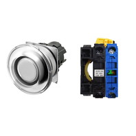 Pushbutton Switch (22-dia.), Lighted, Brushed metal bezel, Mushroom, Alternate, Button color: White, IP66, Screw terminal block, Contacts: NO/Lighting Unit/-, LED lamp color: White, LED Lamp voltage: 24 VAC/DC