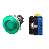 Pushbutton Switch (22-dia.), Lighted, Brushed metal bezel, Mushroom, Momentary, Button color: Green, IP66, Screw terminal block, Contacts: NO/Lighting Unit/-, LED lamp color: Green, LED Lamp voltage: 200/220/230/240 VAC
