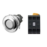 Pushbutton Switch (22-dia.), Lighted, Brushed metal bezel, Mushroom, Momentary, Button color: White, IP66, Push-In Plus terminal block, Contacts: NO/Lighting Unit/NC, LED lamp color: White, LED Lamp voltage: 100/110/120 VAC