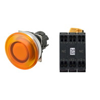 Pushbutton Switch (30-dia.), Lighted, Brushed metal bezel, Mushroom, Momentary, Button color: Orange (Transparent), IP66, Push-In Plus terminal block, Contacts: NC/Lighting Unit/NC, LED lamp color: Orange, LED Lamp voltage: 200/220/230/240 VAC