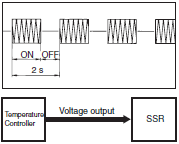 ON/OFF control is a form of control where a heater is turned ON or OFF by turning an SSR ON or OFF in response to voltage output signals from a Temperature Controller. The same kind of control is also possible with an electromagnetic relay but if control where the heater is turned ON and OFF at intervals of a few seconds over a period of several years, then an SSR must be used.