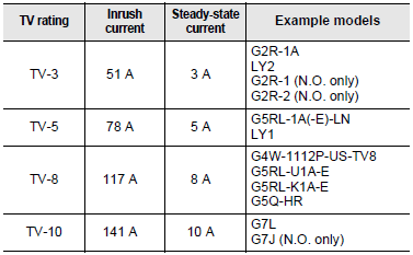 The TV rating is one of the common ratings used to evaluate the inrush current resistance characteristics in the UL and CSA standards. It indicates the load switching level for a relay, including the inrush current.