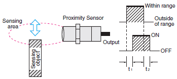 t2: The interval from the point when the standard sensing object moves out of the Sensor sensing area to the point when the Sensor output turns OFF.